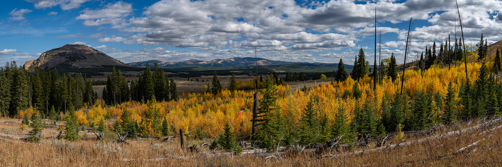 Afternoon sun bathes colorful aspen trees in Yellowstone National Park during late September. I love the look of the fall sky above and the feel of changing seasons in this 3 to 1 panorama.