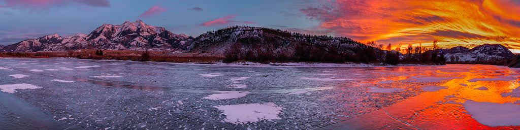 A 180-degree panorama taken standing on the frozen Yellowstone River in Paradise Valley during a vibrant, winter sunset. This photograph features Emigrant Peak, lit up by alpenglow while further to the west the sky burns with shades of red, gold, and orange.