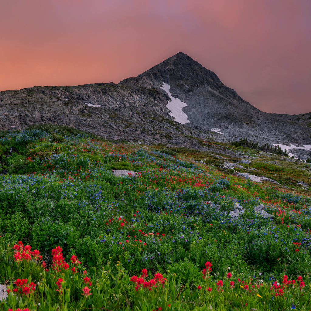 Paintbrush and bluebells fill the foreground at sunset just west of Crazy Peak, the highest mountain in Montana's Crazies. This island range is home to mountain goats and wolverines, and hosts more than a dozen alpine lakes. After a wet spring, the wildflowers in July were as spectacular as any I've ever seen.