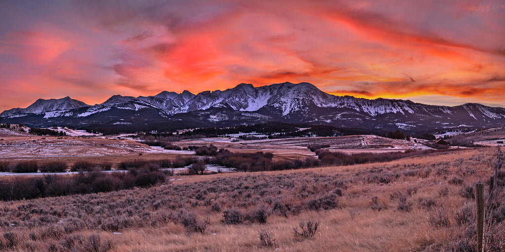 This sunset photograph has striking color, contrast, and shows the majority of the Bridger Range from the north side. 11 prints are available at each size listed, and all come signed and numbered and ship free to the lower 48.
