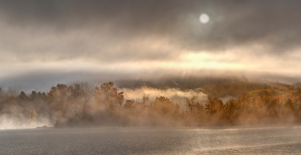 Dawn breaks at the south end of Vermont's Crystal Lake with the sun appearing a pale orb behind a thick veil of mist. I love these fall mornings that hover on the brink of freezing when the sun fights to find the earth and the air is heavy and still.