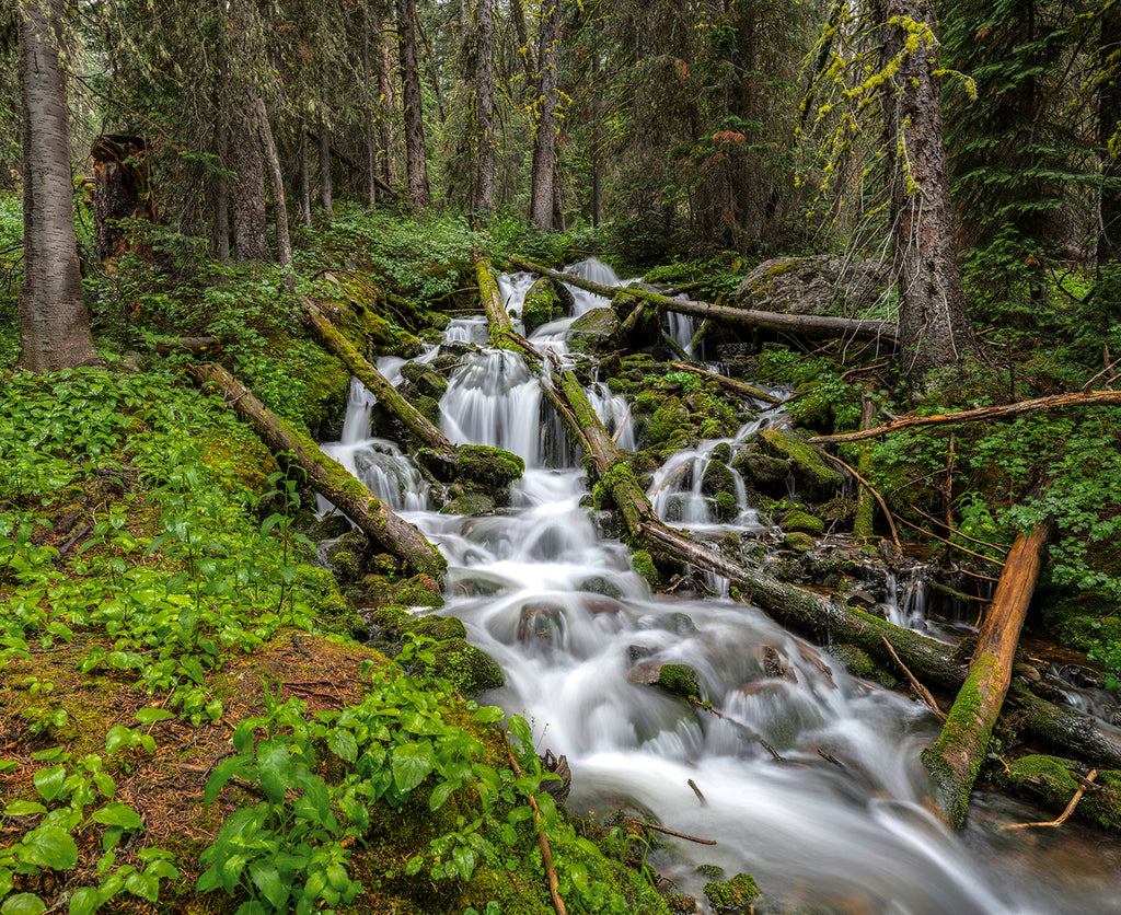 Shower Falls on Hyalite Creek in the Gallatin Mountains of Montana glows in beautiful, late-afternoon light during July.