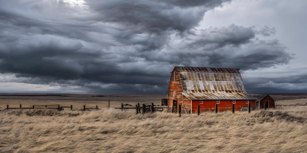 An abandoned barn in Central Montana catches the last rays of a late-winter sun as layered clouds announcing a cold front stream in from the north.