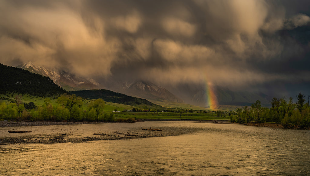A spring rainbow forms over the Yellowstone River at the gateway to Paradise Valley in SW Montana. Amazing clouds and fresh snow on the Beartooth Mountains complete this photo which is offered in two sizes on either archival photo paper or ready-to-hang aluminum. Each size is limited to 11 copies, comes signed and numbered, and ships free to all lower 48 states.