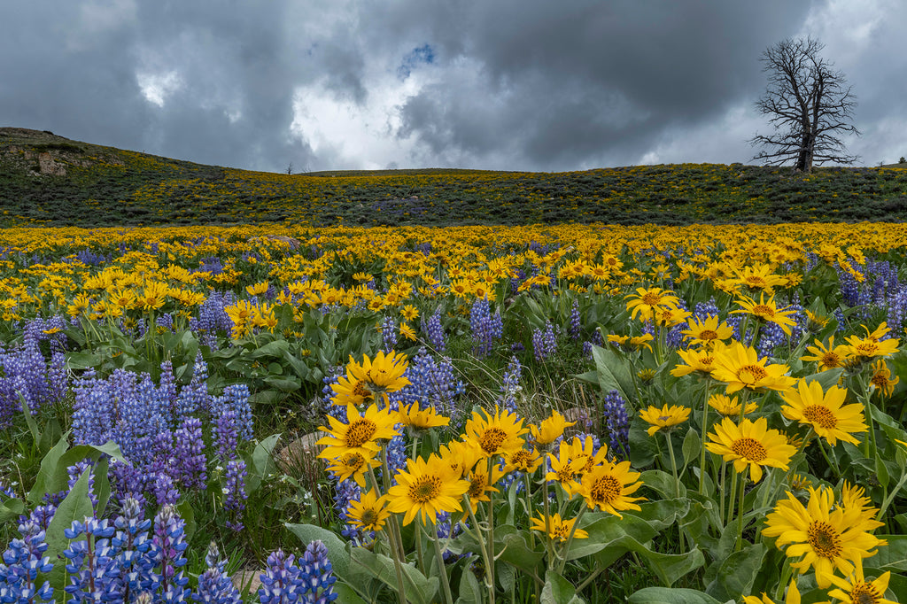 Spring rains come to the high elevations of the Pryor Mountains in Southern Montana. A field overflowing with yellow balsamroot and blue lupines stands ready to receive its drink.