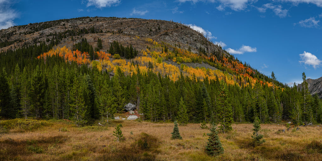Afternoon at the height of fall in the Absaroka Beartooth Mountains brings longer shadows, autumn skies, and colorful aspens above the deep greens of lodgepole pine. Looking at this photo, I can feel the days getting shorter.