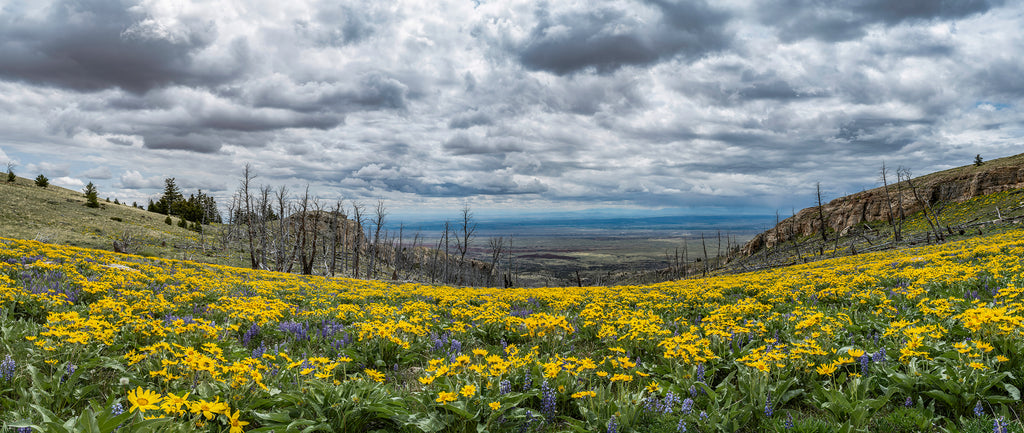 Wildflowers fill an alpine bowl sloping toward the edge of the Pryor Mountains in Southern Montana. A perfect summer sky stretches across the scene well into Wyoming, and all around I could feel summer knocking at the door.
