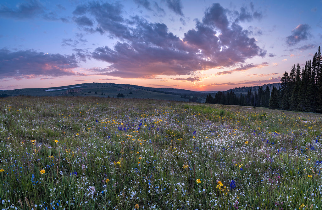 Wildflowers spread out toward the western horizon at sunset in Wyoming's Big Horn Mountains. These high meadows would be hard pressed to fit another blossom in them during early July when the air smells clean and the nights remain cool at high elevation.