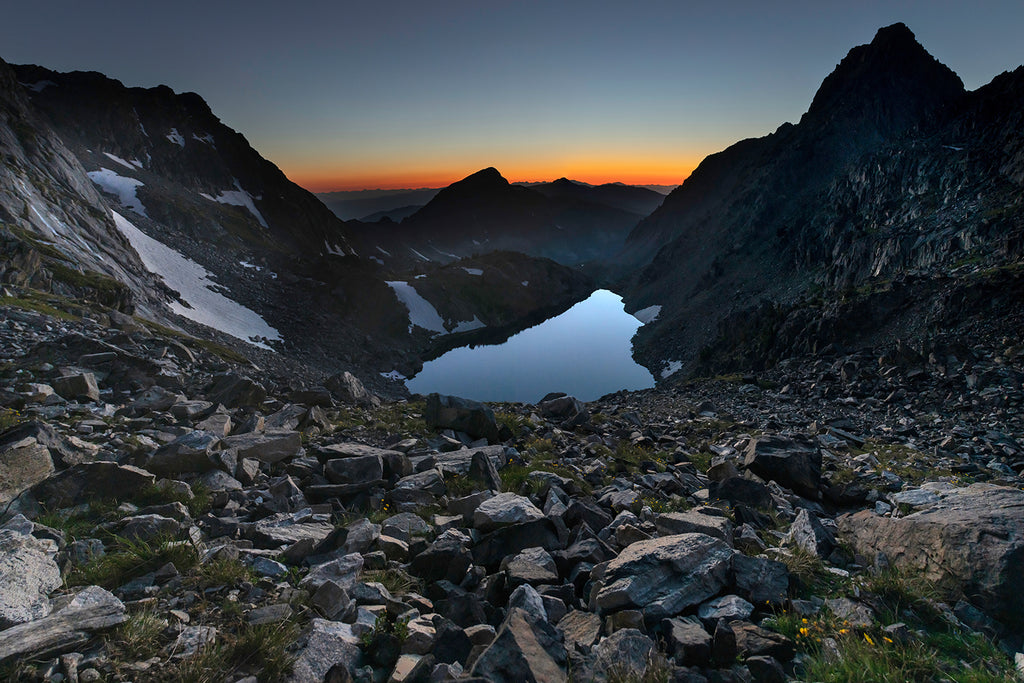 A clear, summer day ends high in the Spanish Peaks Mountains of SW Montana. Shining below is Beehive Lake, a couple of miles north of the popular Beehive Basin.