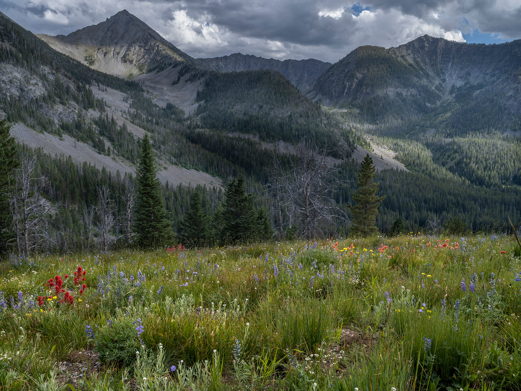 Patchy, evening light finds a meadow of wildflowers high in Montana's Crazy Mountain Range. Summer doesn't last long as this elevation, but for a few brief days it puts on a spectacular show.