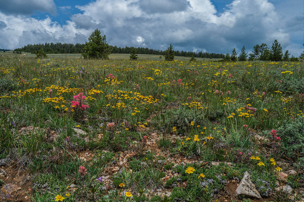 An ant's view of spring in Montana's Pryor Mountains. This photograph has color, contrast, a unique perspective, and a wonderful array of wildflowers under puffy clouds. This is a 24x36 print available on fine, archival paper as well as ready-to-hang aluminum. Each is signed and numbered and ships free to the lower 48.