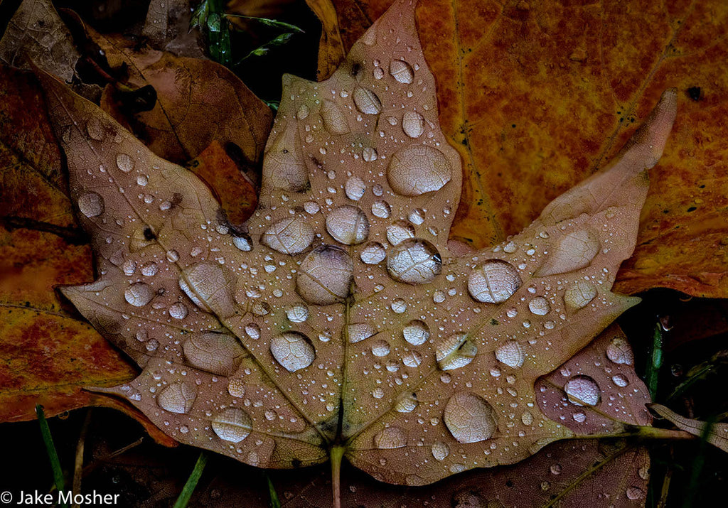 An iconic symbol of Vermont, the sugar maple turns beautiful shades of orange and red each fall. Here, one of its fallen leaves shows off a coat of water droplets. Shipping for framed prints is extra, calculated depending upon destination.