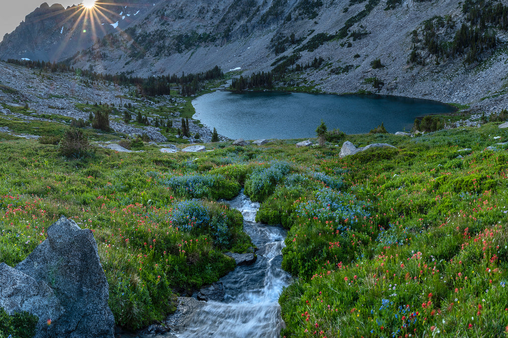 Another day in the books in SW Montana. The setting sun kisses Cottonwood Lake and a foreground full of wildflowers, high in the Crazy Mountain Range, goodnight.