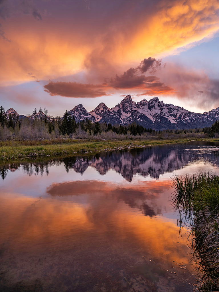 The Tetons reflected at Schwabacher Landing during a fiery, early-summer sunset. This portrait orientation photo, taken with a high-res medium format camera, has incredible detail, color, and depth of field.