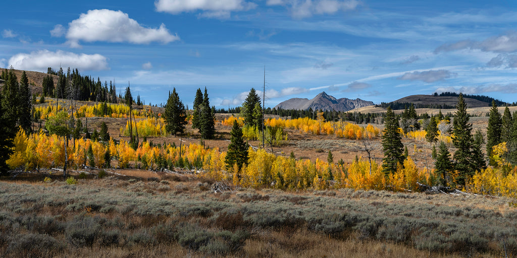 Golden aspens stand in autumn sage before Electric Peak on the edge of Yellowstone National Park. The sky above is quintessential fall and the entire photograph has the perfect feel of changing seasons.