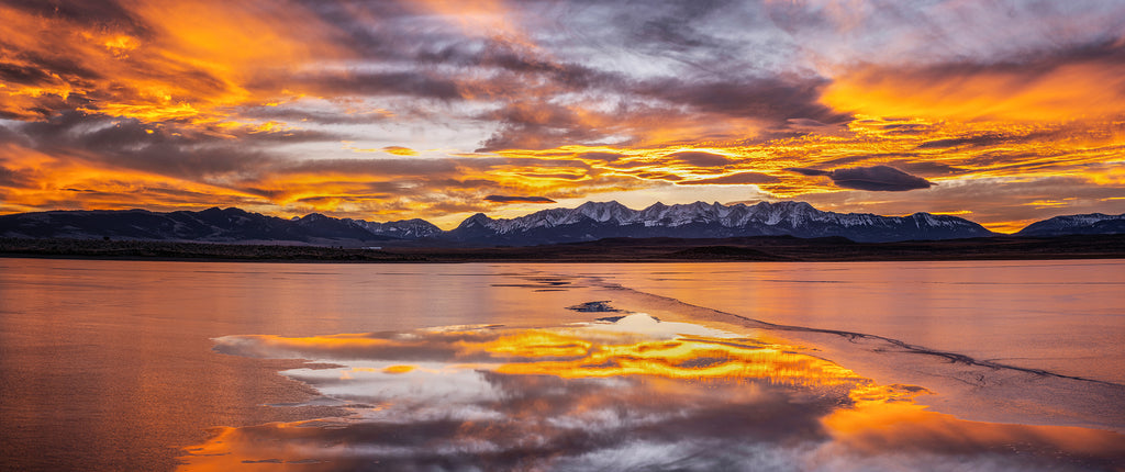 A beautiful sunset over the Bridger Mountains as seen from frozen Cottonwood Reservoir near Wilsall, MT.