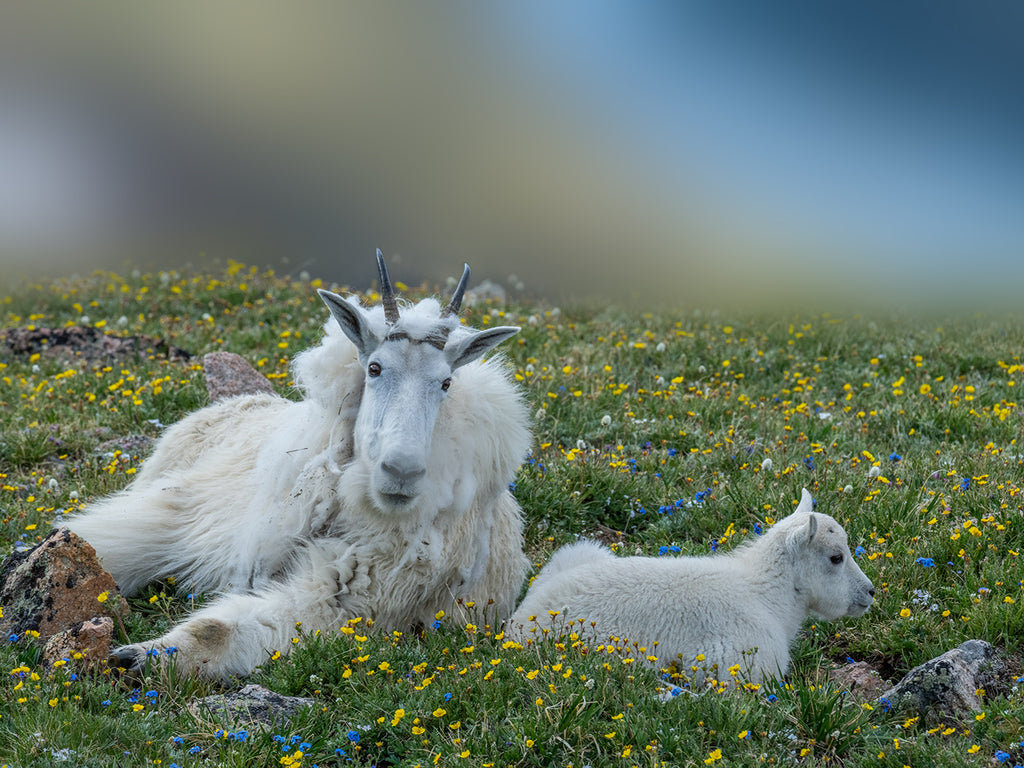 A nanny mountain goat and her kid enjoy some easy living on a summer afternoon high in the Beartooth Mountains of Wyoming. This lush landscape, overflowing with wildflowers, will transform to a winter wonderland in less than 3 months.