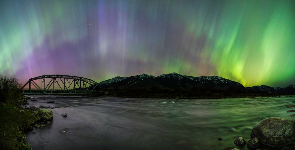Beautiful pastel light pillars fill the sky over the Madison River and mountains at Three Dollar Bridge during a spectacular light of northern lights. This display was by far the best I've seen in Montana and this photo, taken shortly after dark, has a wonderful nighttime feel.