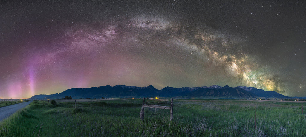 The Milky Way and Aurora fill the night sky over the entire span of the Bridger Mountains north of Bozeman, MT. For this shot, I wanted to get the whole length of this mountain range which meant setting up further from whatever a normally have in my foreground. It gives a wonderful sense of perspective -- large mountains against a truly immense galaxy.