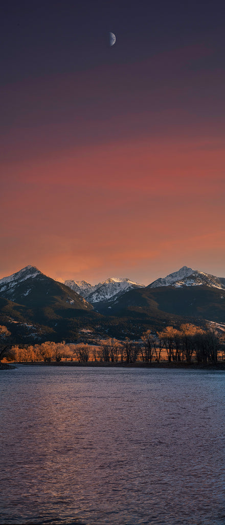 A half moon shines high over the Yellowstone River in Paradise Valley, Montana during a December sunset.