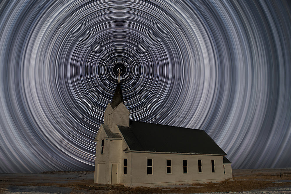 A favorite subject for my photos, this mostly-abandoned Eastern Montana church commands the foreground during two nights' worth of exposures.