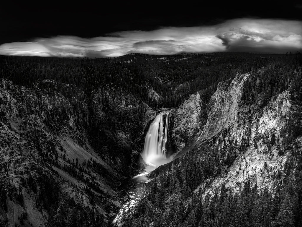 A band of low clouds hangs over the Lower Falls of the Yellowstone River in the heart of Yellowstone National Park during late fall. With moonlight shining behind me, and no breeze, a two-second exposure smoothed the water to silk and provided enough exposure for astounding detail in the foreground. This black and white photo is available at a large 44x58 inches as an edition of 10 prints. It's offered as ready-to-hang aluminum art as well as on archival-quality photo paper. Each is signed and numbered. Framing options are available by special request for the paper.