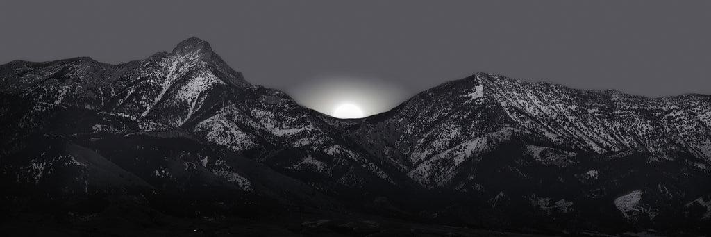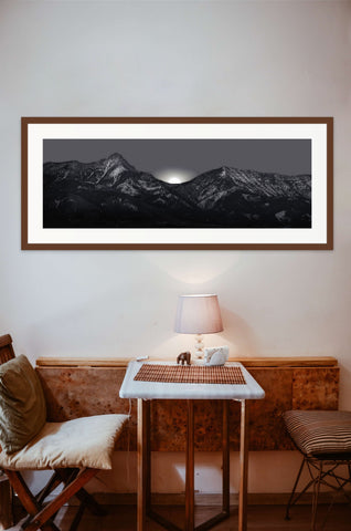 Shot intentionally in black and white, this photograph has a lovely mix of sharp contrast and subtle, night-time feel. It's offered in two sizes, 10x30 and 15x45, as a print and also as finished, framed art. The frame is authentic, smooth-finished Montana barn wood with a clean, 2" linen mat. The finest, anti-UV acrylic covers the photo, and each piece is signed and numbered, limited to a run of 25.