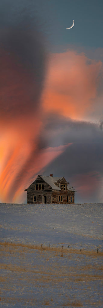 I absolutely love this photo. The homestead is one of my favorites, featuring in several of my photographs, and on this evening the conditions were the best I've ever seen to shoot a young moon as the sun set. Spiraling clouds lit up with shades of red, salmon, orange, and gold, adding the perfect background to this house on a high hill in the middle of Montana's prairie.