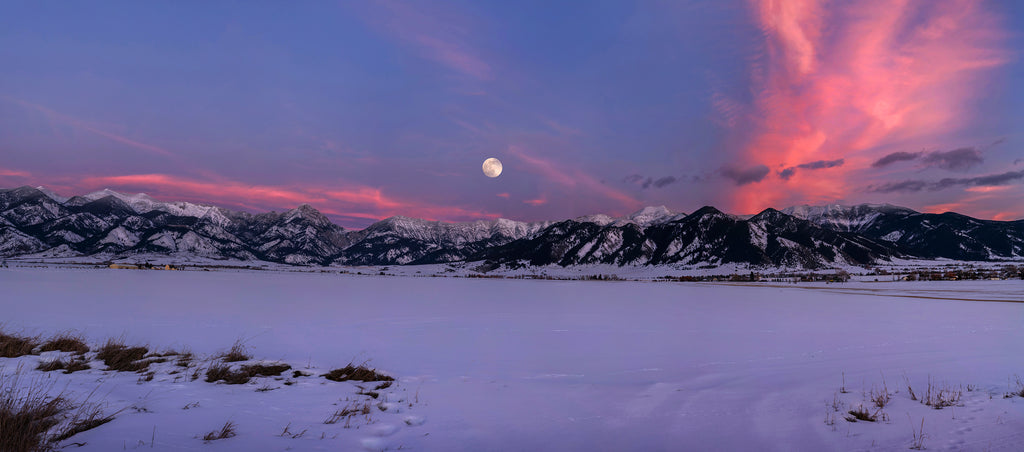 The winter full moon rises over Montana's Bridger Mountains at sunset on a cold evening. This photo has perfect feel of winter - a foreground of snow in soft, evening shades of blue, stubble grass poking from its surface, alpenglow over tall, snowy peaks, a trailing, pink cloud, and a beautiful, full moon.