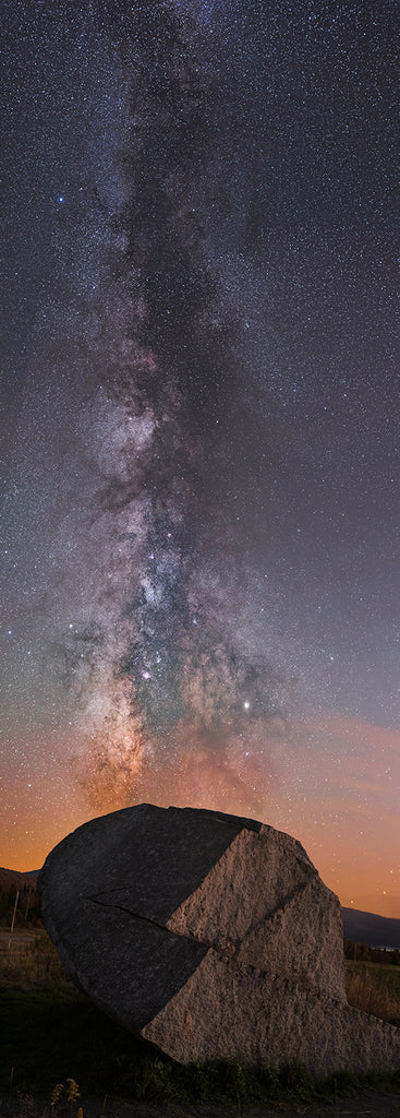 The Milky Way shoots into the October sky over Sentinel Rock, Vermont's smallest state park, above Willoughby Lake. A faint glow from the setting sun remains orange on the horizon below the core of our galaxy. This picture is two and a half times as tall as wide and looks best at 20x49 inches. It's offered here on metal or as a stand alone print via the drop down arrow.