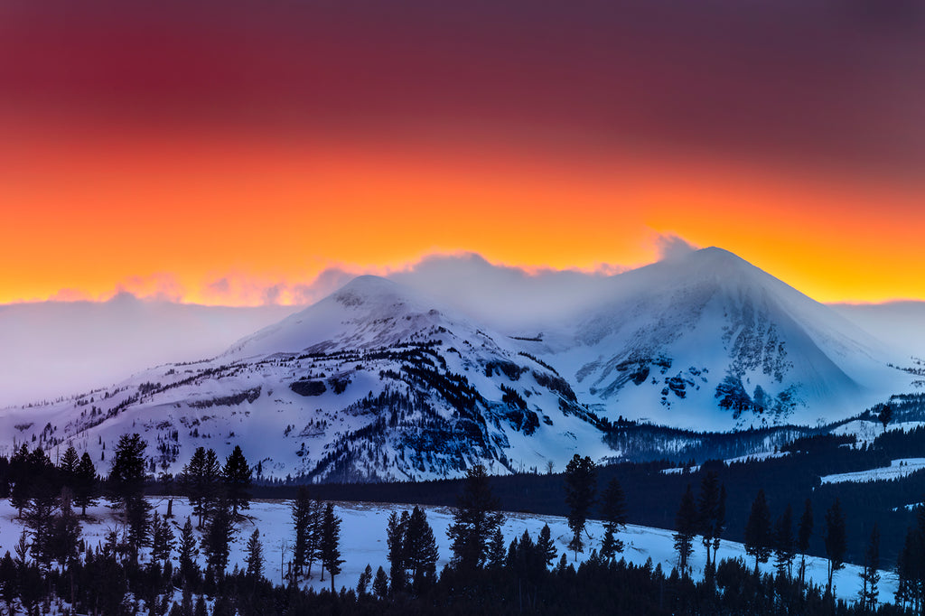 Standing in Yellowstone National Park's Blacktail Plateau, I watched a winter day end with one of the most colorful sunsets I've ever seen. It had been a day of low clouds that only began to break during the final moments of sunlight, setting the sky on fire with shades of purple, red, and salmon.