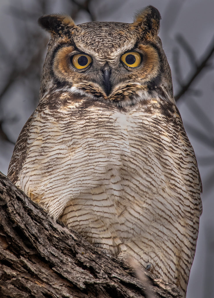 A great horned owl fights to stay awake during the middle of the morning in Montana. Perched in a winter maple tree, he had drawn the attention of a flock of crows, adversaries which, during the day and with numbers on their side, hold the upper hand. Distracted by the crows, he let me get closer than normal, and I was able to capture some of the intricate feather detail of his face and eyes.