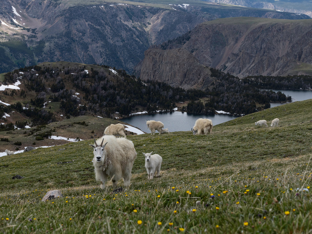 As a group of nanny and kid mountains goats feeds above Twin Lakes in Montana's Beartooth Mountains, one mother decides to introduce her baby. These curious animals have few natural predators, living year round in some of the harshest environments in North America. Protected all winter by thick fur, their coats are shedding now, preparing them for a few short weeks of summer.