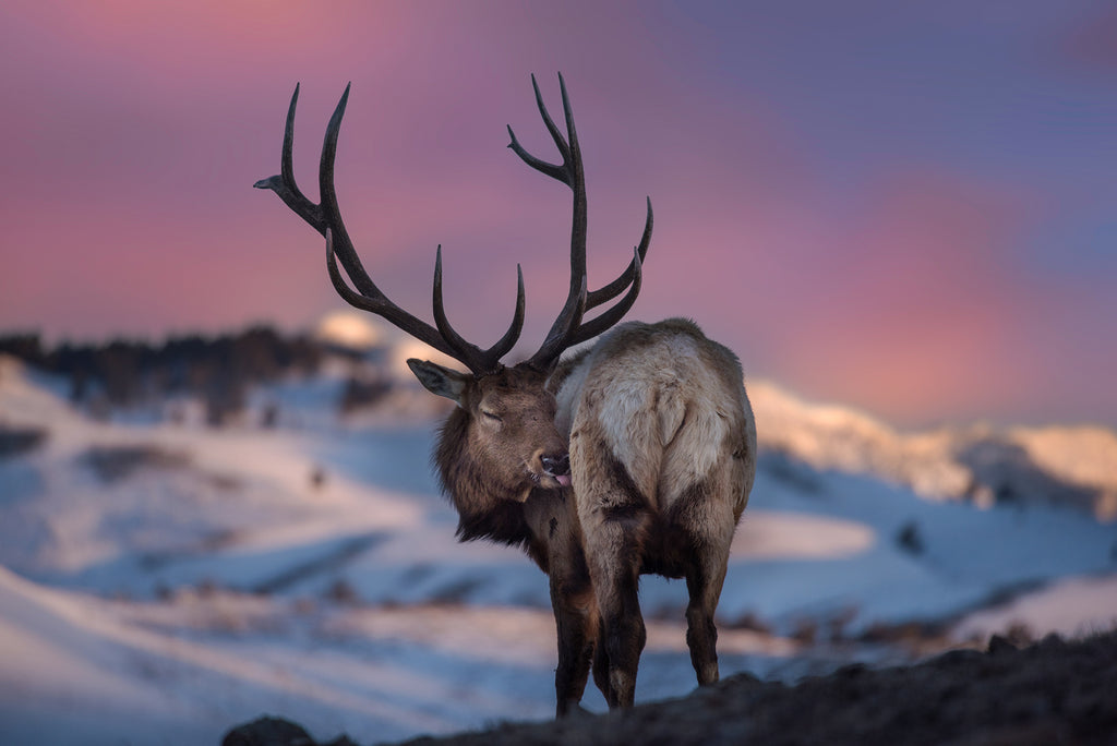 Elk generally migrate away from the high mountains where they spend their summers, seeking gentler winter range less apt to be buried by snow. Bulls are the last to leave the wilderness, and weakened after the rut they don't always make it. I watched this elk for more than a month, living on a small island of open ground surrounded by miles and miles of winter. By the middle of March, the toughest time for animals dependent on grass, he was a rack of bones and I expected him to succumb any day. But these animals are nothing if not tough, and miraculously I believe he made it, the spring thaw coming just in time. Here, he nuzzles his flank at sunset, the sky behind him a beautiful blend of alpenglow and snow.