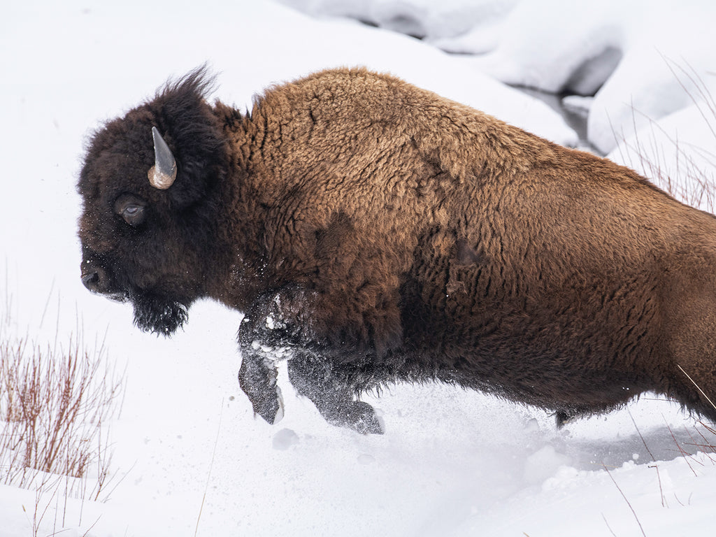 A huge bull bison jumps across a small seep in the heart of Yellowstone National Park. These giant animals are surprisingly fast and agile and, when full grown and in their prime like this bull, have no natural enemies.