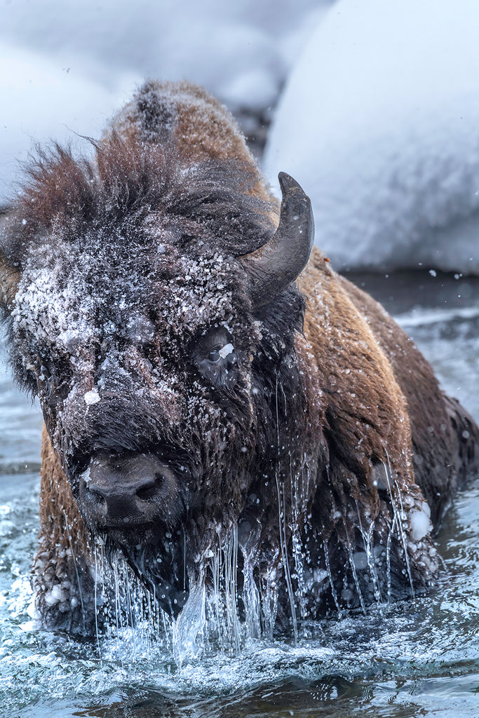 On a sub-zero morning, a huge bull bison plows through the frigid waters of Soda Butte Creek in Yellowstone National Park. Well equipped to handle these conditions, rather than struggling up a steep bank through more than three feet of snow, he waded upstream more than a half a mile to find an easier place to exit the water.