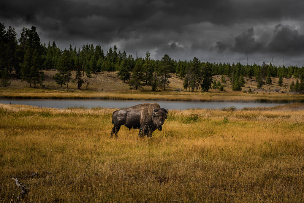 A Yellowstone Park bison stands in early sunlight before a fall snow squall swallows him.