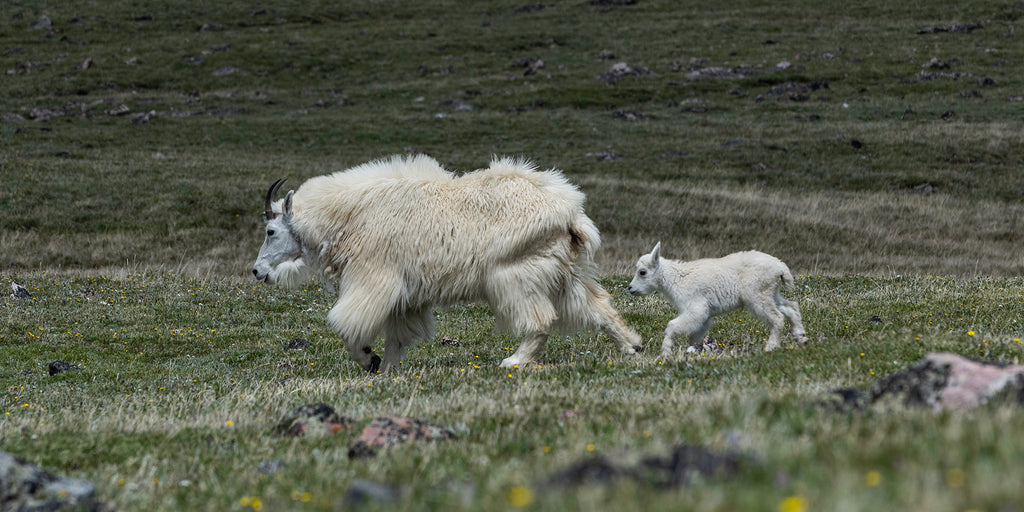 A nanny and kid mountain goat match strides across the high Beartooth Wilderness in Montana during early summer. These amazing animals don't move down from the high country during winter, instead relying on their thick coat of fur to protect them from some of the harshest elements in North America.