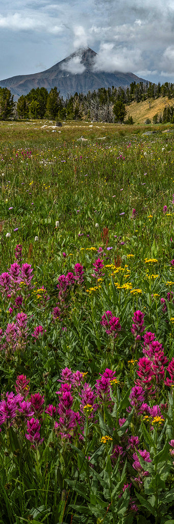 Clouds pass in front of Lone Peak, parting to reveal the summit, while Indian Paintbrush fill a foreground of wildflowers near Beehive Basin. This photograph is a 1:3 vertical panorama designed to fit spaces like a stairwell landing, a corner wall, or the end of a hallway. It's available on the finest ready-to-hang aluminum in a variety of sizes. Each size is limited to 11 copies, comes signed and numbered, and ships free to all lower 48 states.