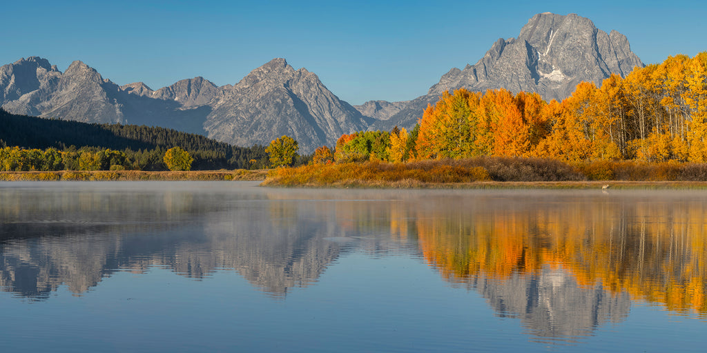 A coyote decides to watch the sunrise at Oxbow Bend on the Snake River in Grand Tetons National Park. With a backdrop of aspens at their height of fall color and beyond them the hulking Mount Moran of the Tetons, this scene has perspective, detail, and the feel of fall all around.
