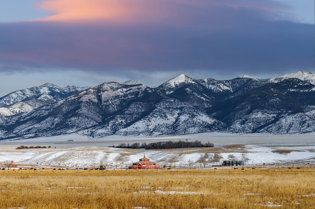 A round barn sits below Montana's Tobacco Root Mountains at sunset. A rarity anywhere in America, this barn is a reminder of bygone days when hay was put up with horse drawn wagons.