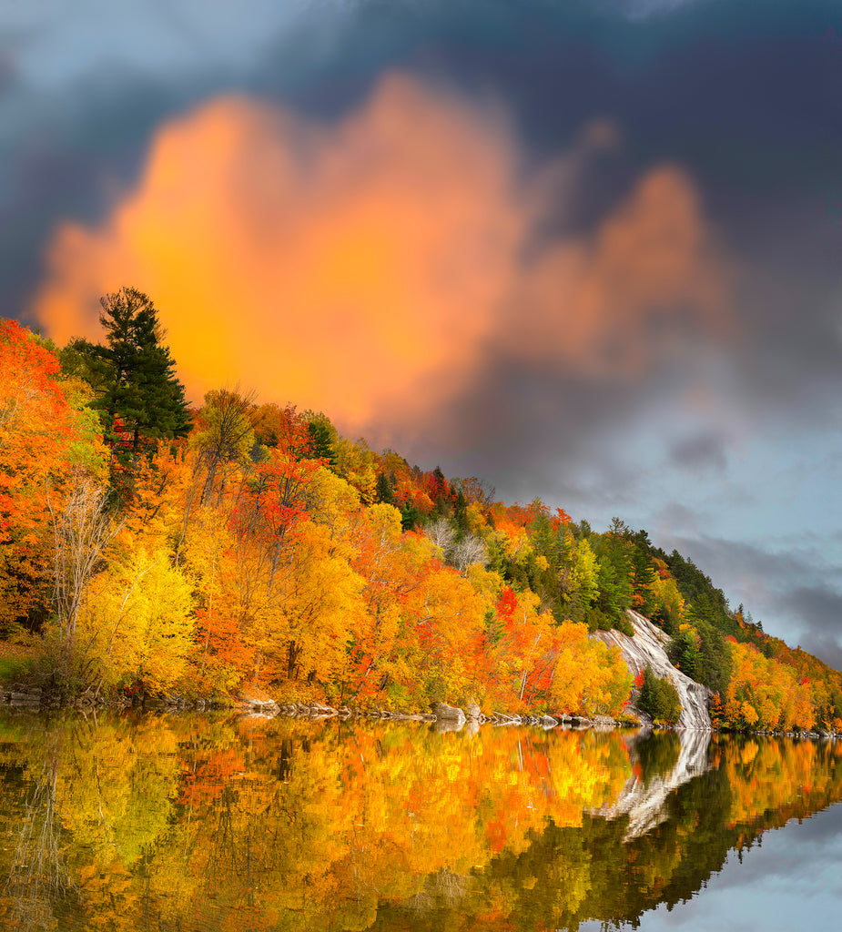 A low ridge of Norris Mountain is reflected in Pageant Cove at Vermont's Crystal Lake. This photo is a panorama composed of several medium-wide-angle shots, full of crisp detail and stunning color contrast. Additional larger sizes are available upon request.
