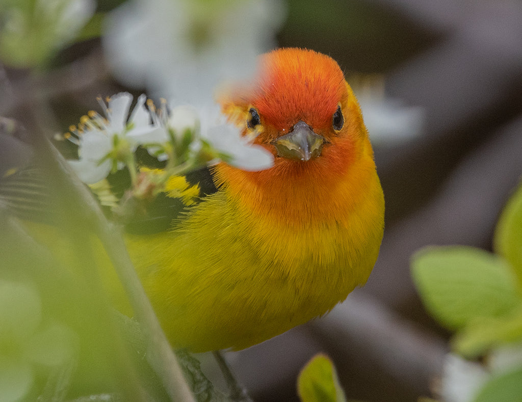 A western tanager plays hide and seek with me in a flowering plum tree during May in Bozeman, Montana. These highly-colorful birds have a tropical appearance, and with good reason. They spend their winters in Central America, making the long journey to their breeding grounds in the Rocky Mountains every spring.