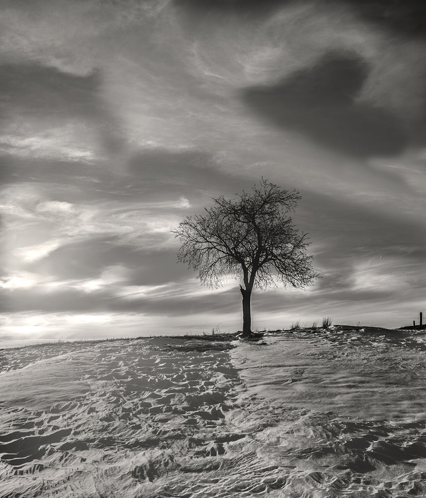 Clouds form a heart above a lone tree on the prairie of Central Montana. This is a beautiful black and white photo with a wavy, finger-painted feel to the clouds and good detail in the wind-sculpted snow.