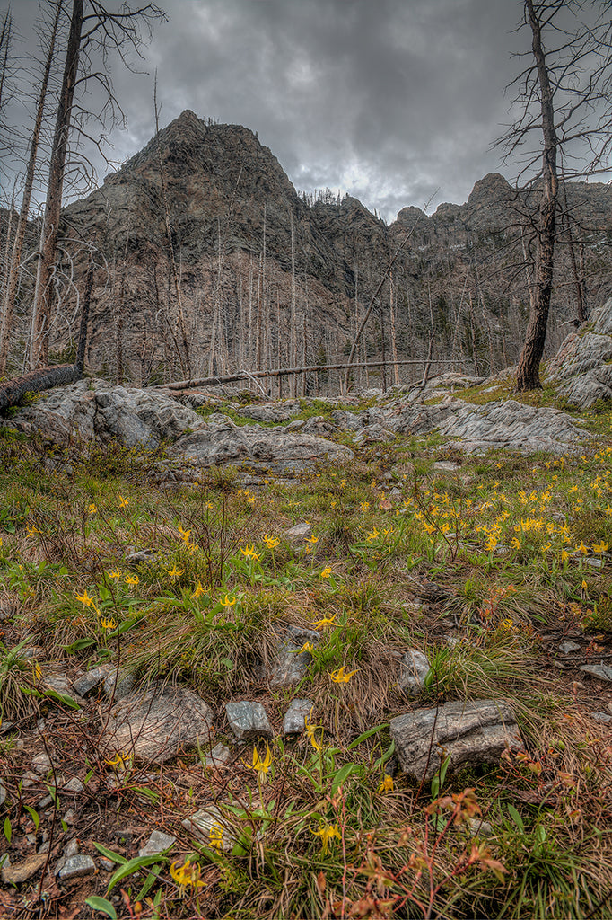 In a high mountain burn deep in Montana's Absaroka Wilderness, glacier lilies spring to life as soon as the snow melts. In time, they will cover nearly every inch of bare ground, carpeting these shadeless openings, helping hold soil in place and begin a new cycle of forest. This print is offered as a 12x18 photograph.