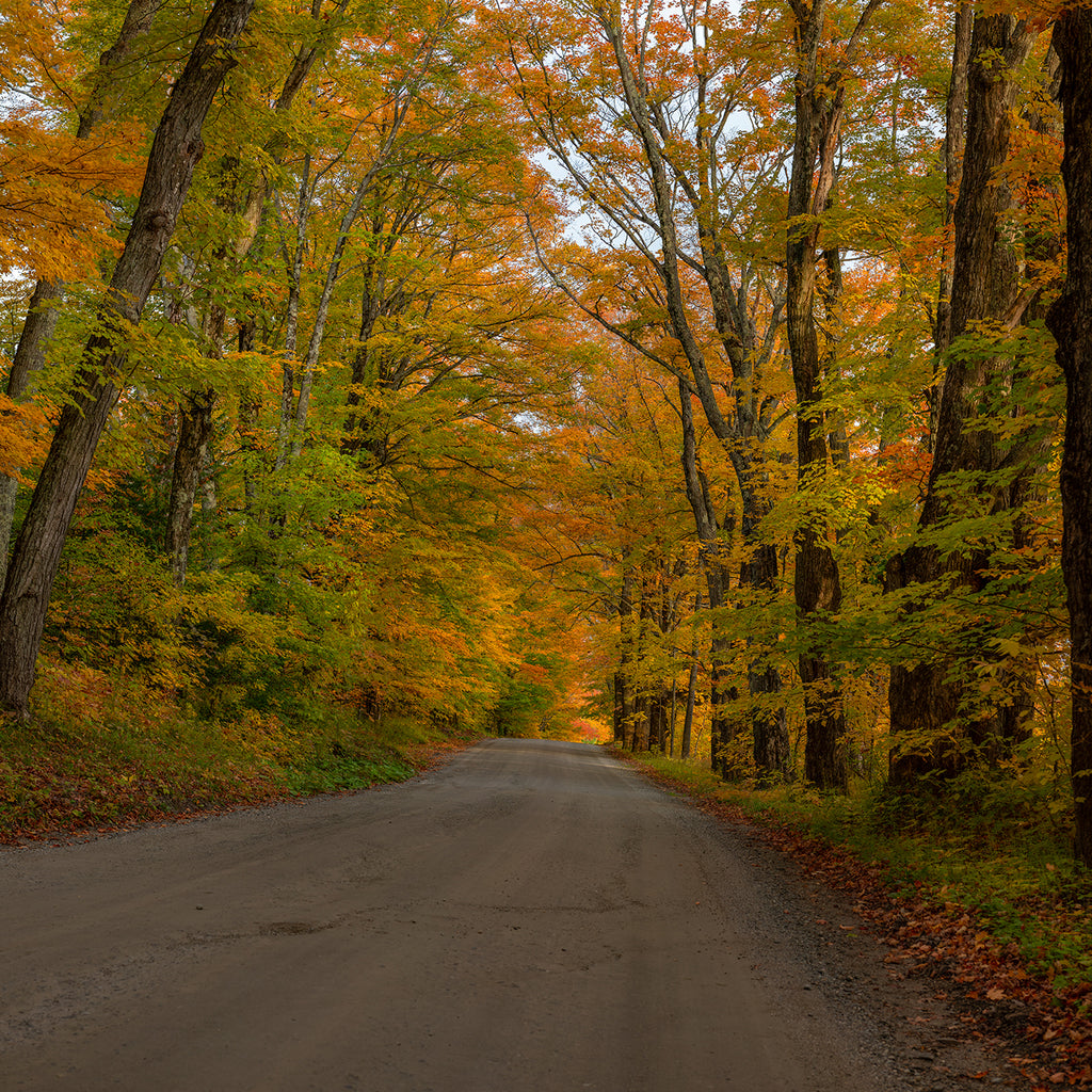 Sugar maples arch over Burton Hill Road in Northern Vermont during autumn. This panorama, composed of 6 wide-angle shots, lends a beautiful perspective to a country road during one of New England's prettiest times of year. Larger sizes are always available upon request.