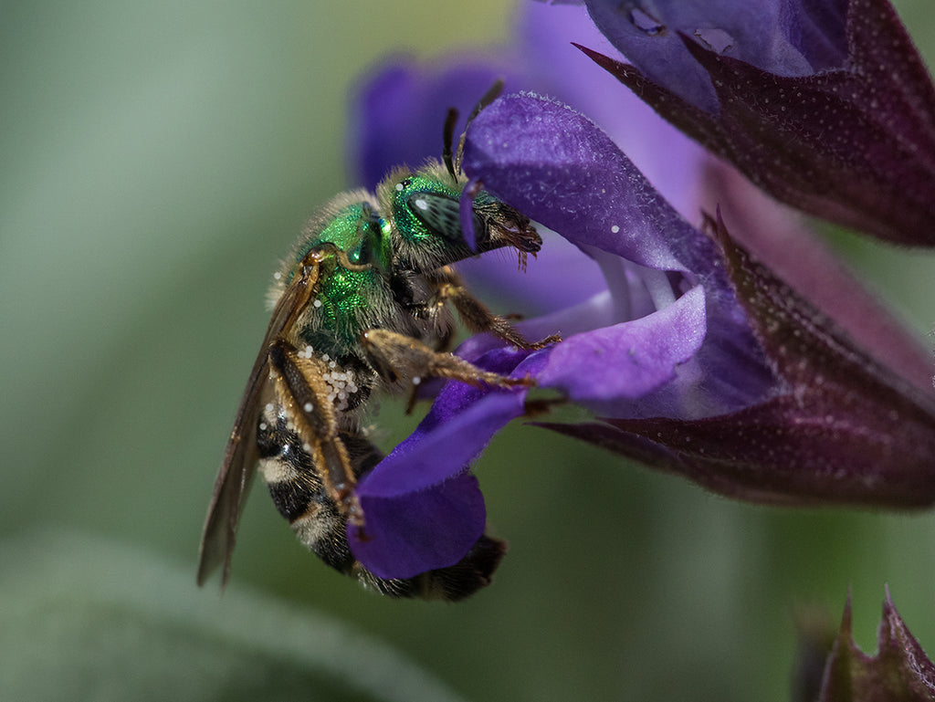 A bee crawls out of a blossom during Montana's late summer, balls of pollen clinging to its legs, its head an iridescent green. Bees are especially active this time of year, sensing the approaching winter weather that's just around the bend.