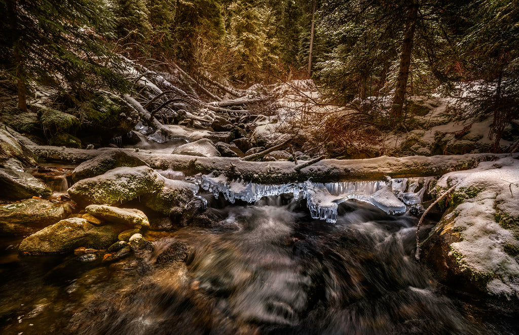 During a few moments of afternoon light, this Montana stream, Cascade Creek in the Gallatin River Drainage, takes on a magical appearance where blue icicles hang from a fallen pine spanning the current. This photograph has a wonderful balance of light and show, motion and stillness, and, as as stitched panorama composed of multiple images, amazing detail and resolution. I'm offering it as a limited edition of 10, both as an archival-quality paper print and a signed piece of art on Pure Art Printer's ready-to-hang aluminum.