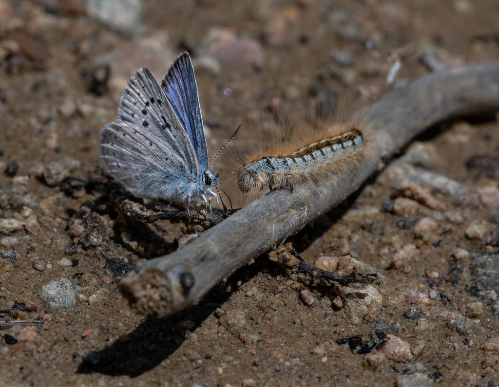 A silvery blue butterfly and caterpillar study each other in this image of present and future colliding. I spent a couple of hours at a mud puddle in Montana's Gallatin Mountains taking macro shots of insects, and caught this interaction purely by chance. It's offered here as an 8x10 print, but can be printed in many additional sizes.