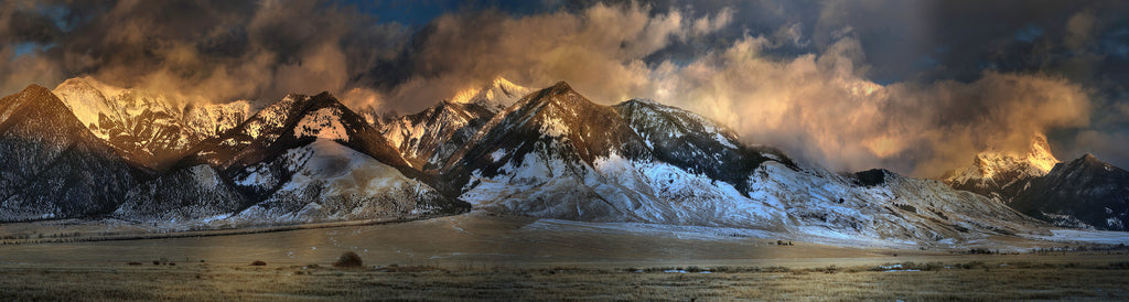 Evening falls on the Madison Valley during mid-winter. While snow clouds form over the Sphinx, bands of sunlight stream onto the prairie as another day comes to a close.